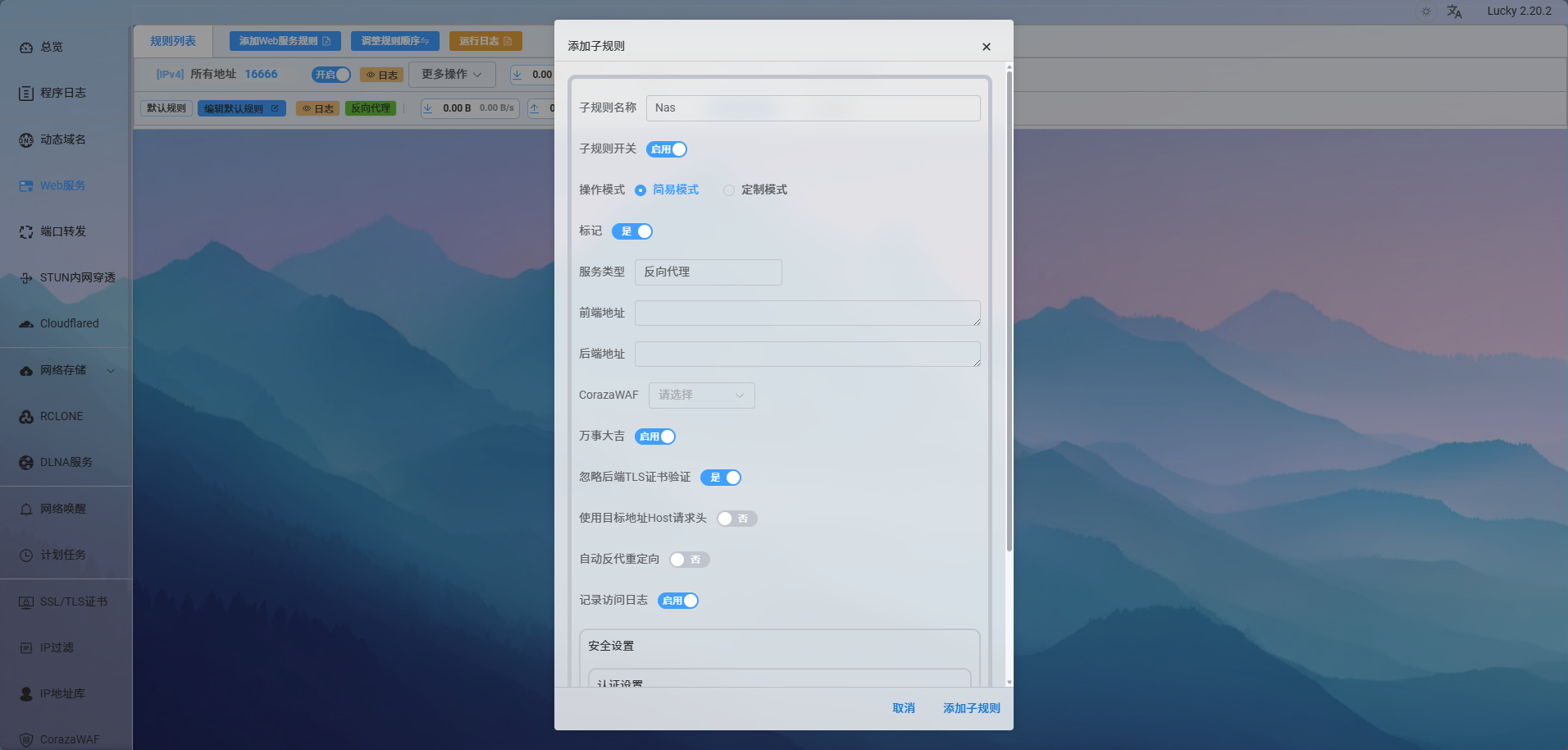 配置完成后添加子规则,名称自定义、服务类型反向代理、前端地址为自定义前缀域名(例:http://XX.347766.xyz)、后端地址为内网地址和端口(例:http://192.168.1.30:5666)