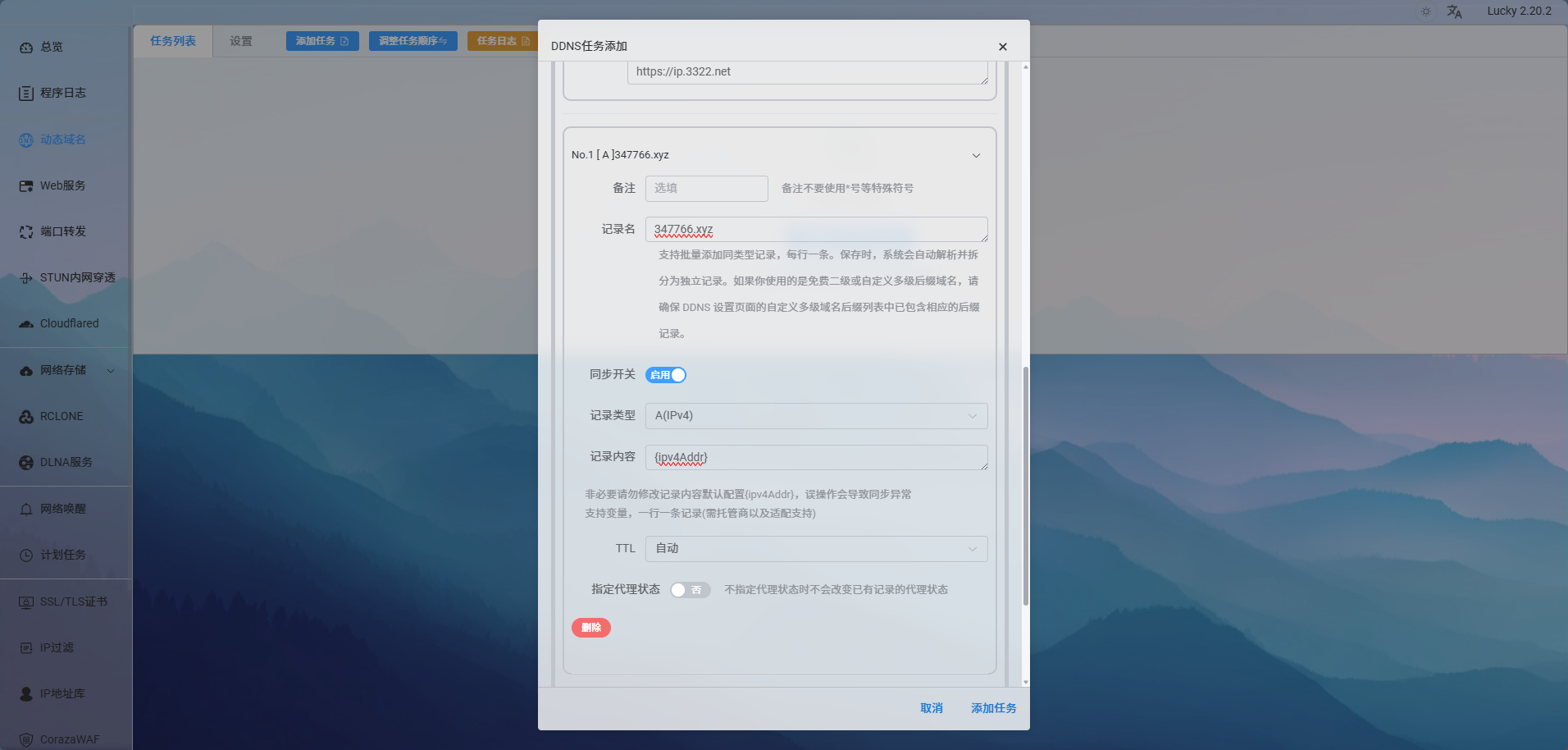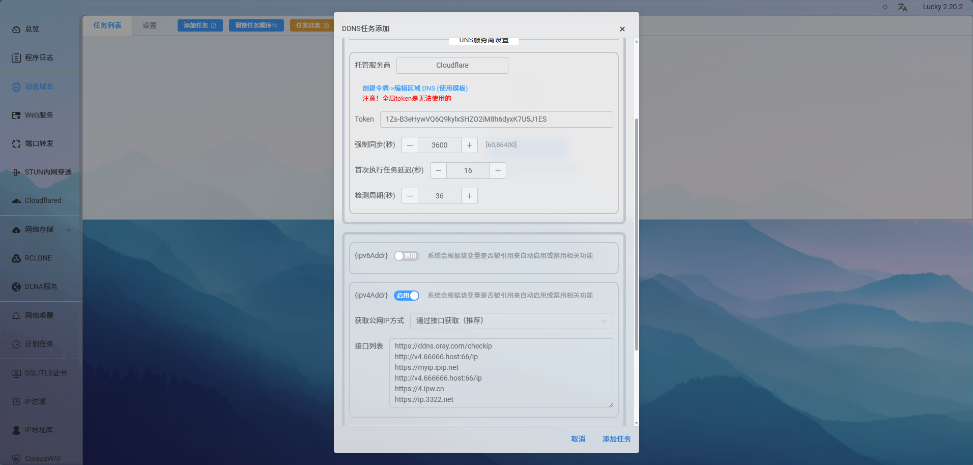 完成上述配置后,重新登录后,点击左侧侧边栏“动态域名”,来到动态域名界面,点击“添加任务”,弹出配置窗口,服务商选择“Clodflare”后,创建令牌