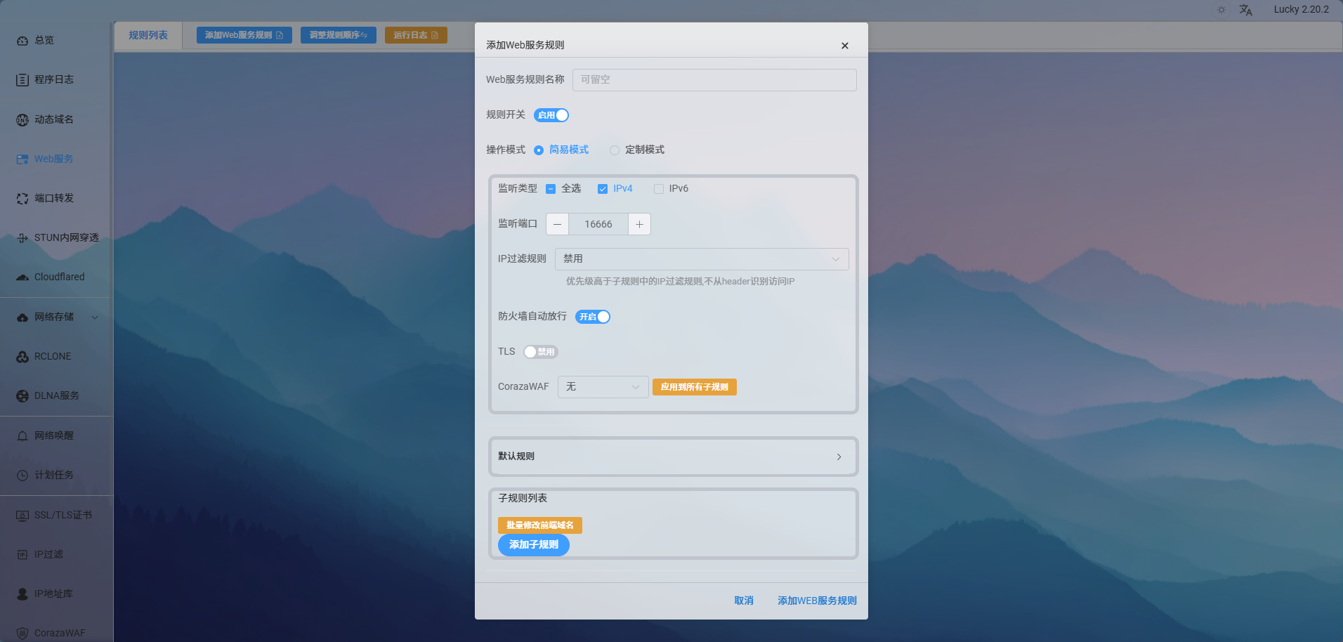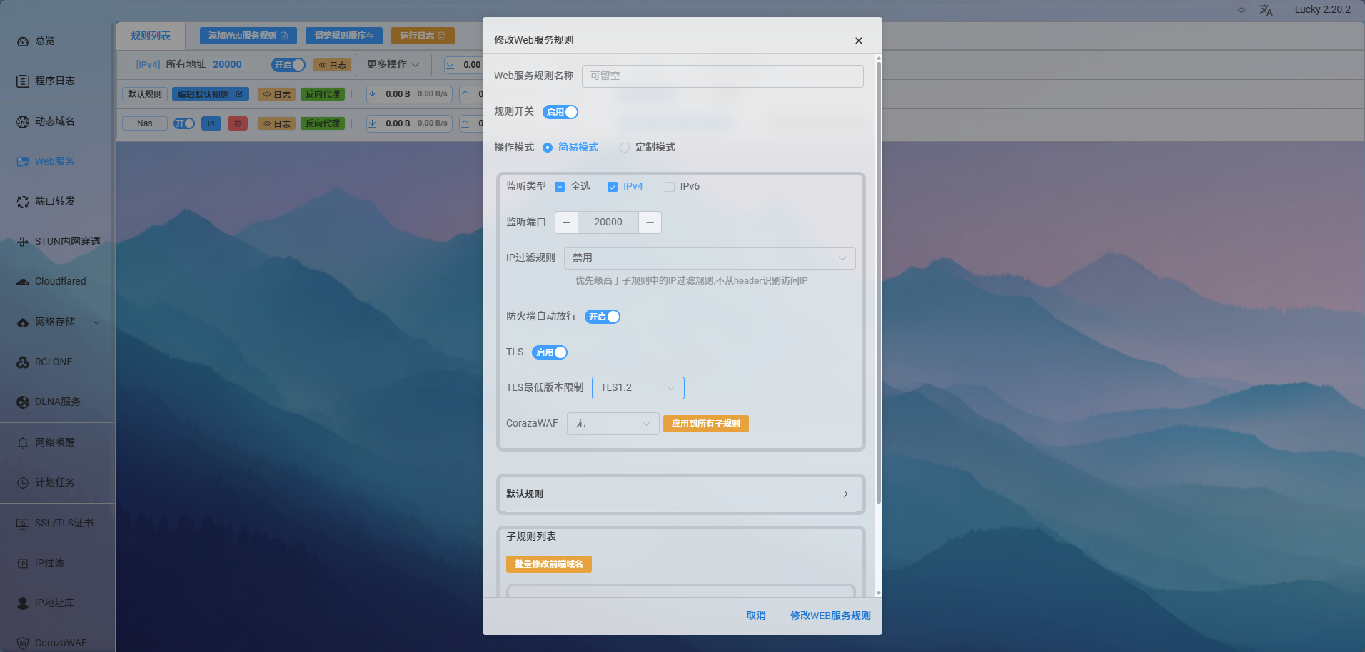 点击左侧侧边栏“Web服务”,来到Web服务界面,点击“添加Web服务规则”,弹出配置窗口,监听类型根据上面的配置选择 IPV4 或 IPV4,监听端口为反向代理后的端口