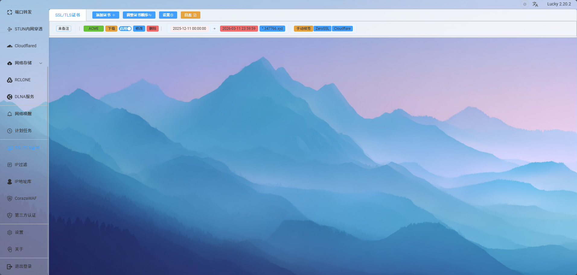 如果要开启 TLS 证书,点击左侧侧边栏“SSL/TSL证书”,来到SSL/TSL证书界面,点击“添加证书”,弹出配置窗口,添加方式选择“ACME”,验证方式选择“Cloudflare”,将 token 复制进来,域名填写泛域名即可,等待获取证书后,开启 TLS 即可